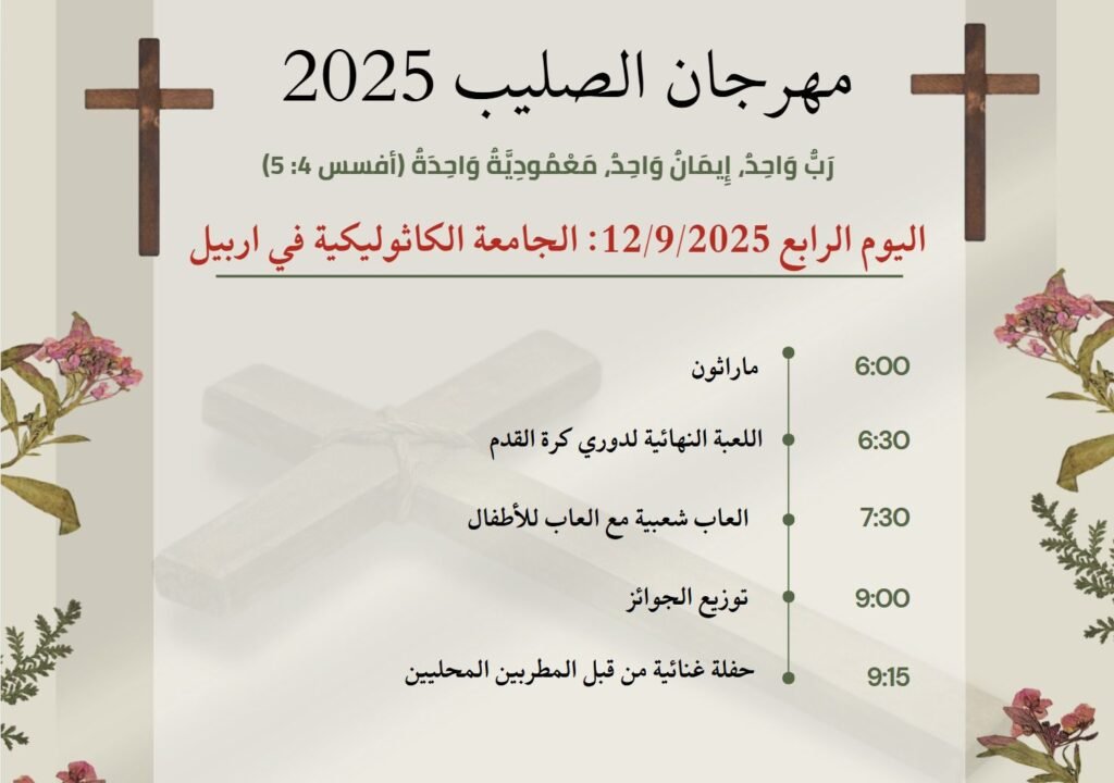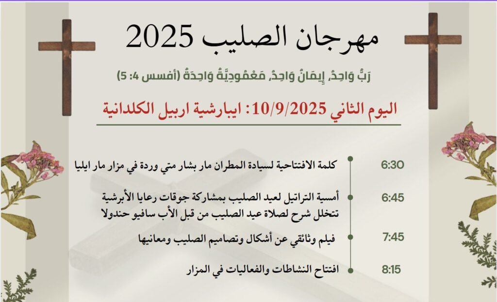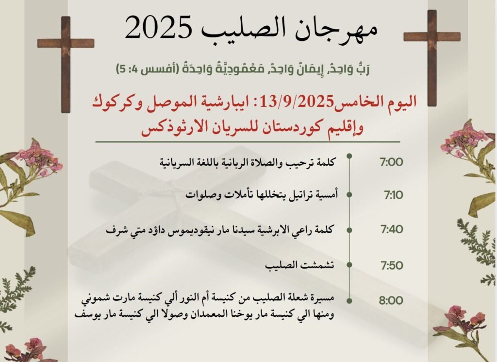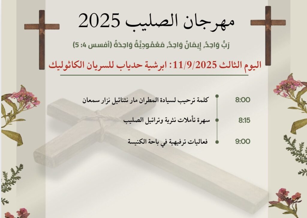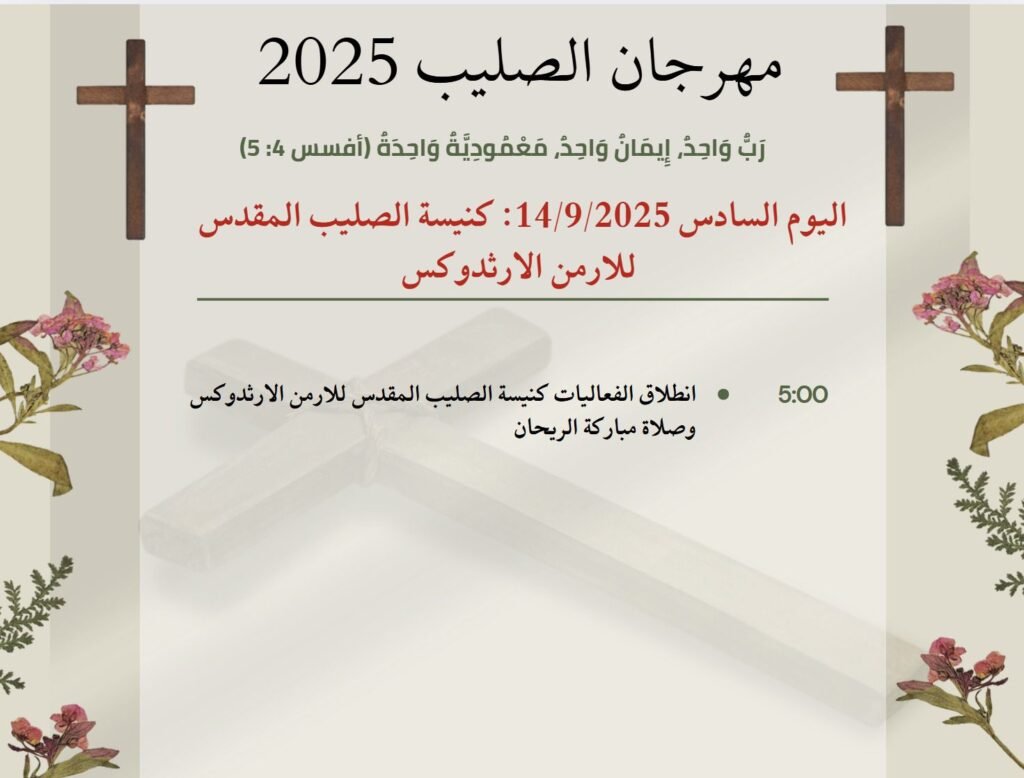 فعاليات مهرجان الصليب المسكوني سبتمبر 8, 2025 326 تحت شعار رَبٌّ وَاحِدٌ، إِيمَانٌ وَاحِدٌ، مَعْمُودِيَّةٌ وَاحِدَةٌ (أفسس 4: 5) تدعوكم كنائس عنكاوا للمُشاركة في فعاليات مهرجان الصليب المسكوني، والتي ستنتطلق يوم الثلاثاء 9/9/2025 وفق البرنامج الاتي.